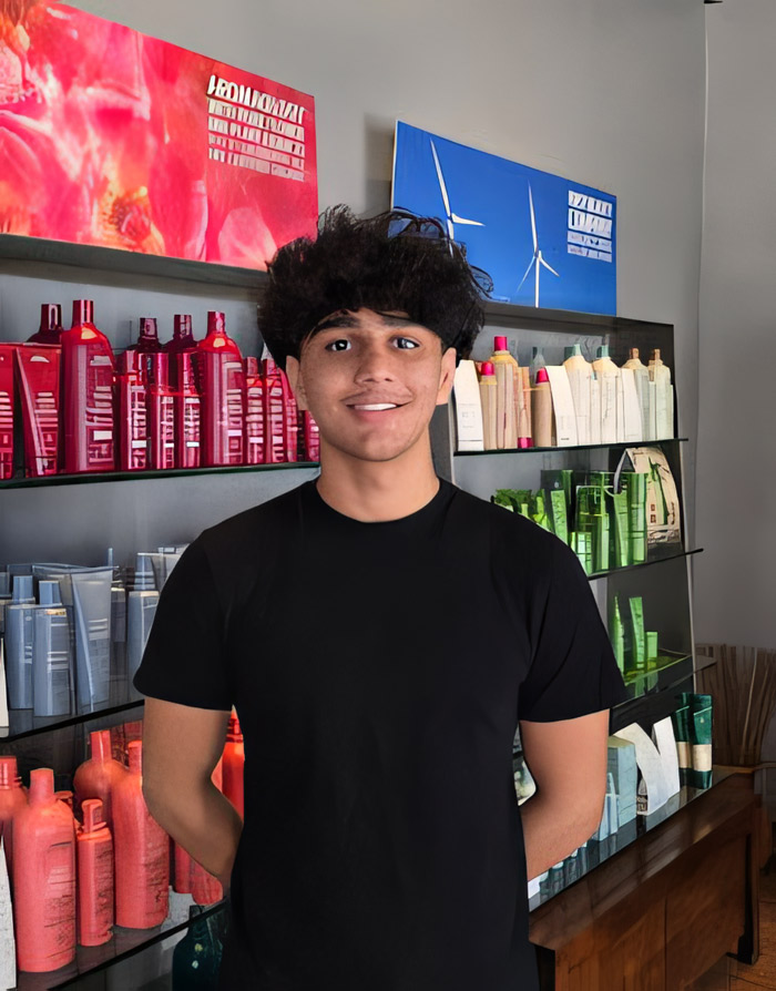Imran began working at Phoebe Grey in July of 2024. He enjoys getting textured haircuts, and his favorite AVEDA product to use is the men Pure-formance Grooming Clay!